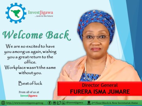 Welcome Back We are so excited to have you among us again, wishing you a great return to the office. Workplace wasn't the same without you. Best of luck. From all of us at InvestJigawa