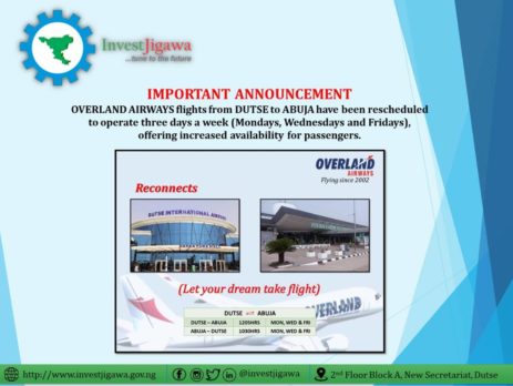 OVERLAND AIRWAYS flight from DUTSE to ABUJA have been rescheduled to operate three days a week (Mondays, Wednesdays and Fridays), offering increased availability for passengers.